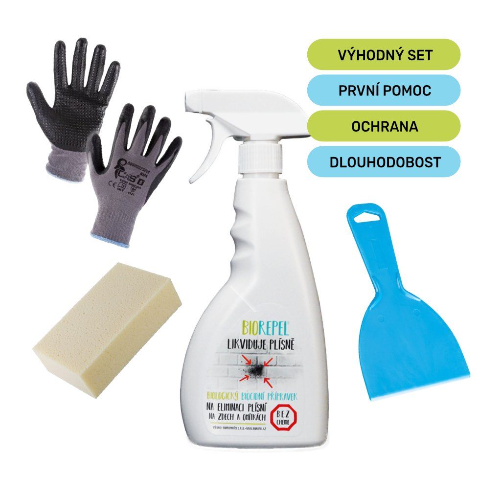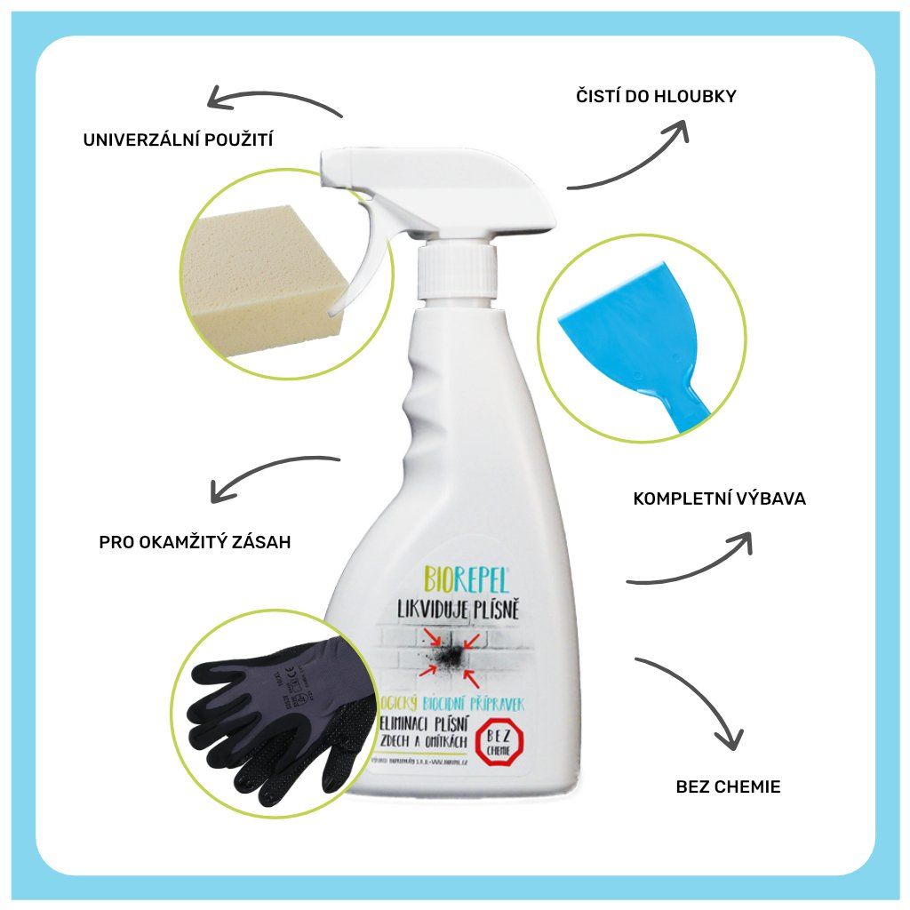 Upozornění: Uchovávejte mimo dosah dětí. Před použitím si vždy přečtěte návod na spreji Biorepel. Při seškrabování suché plísně doporučujeme místo lehce navlhčit, aby se zamezilo prášení spor.