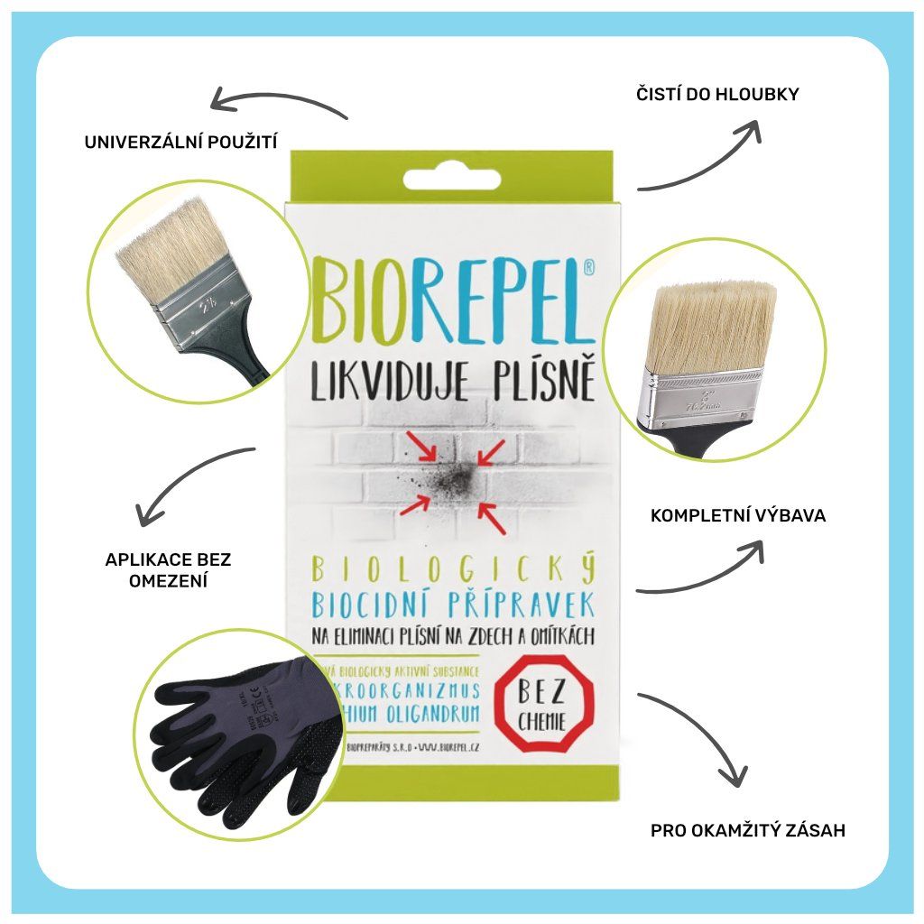 Biorepel ale pracuje jinak. Obsahuje naši patentovanou aktivní látku, která proniká hluboko do zdi a plíseň likviduje u kořene. Díky tomu má dlouhodobý účinek, funguje bezpečně bez chemie a hlavně je vyroben v Česku.