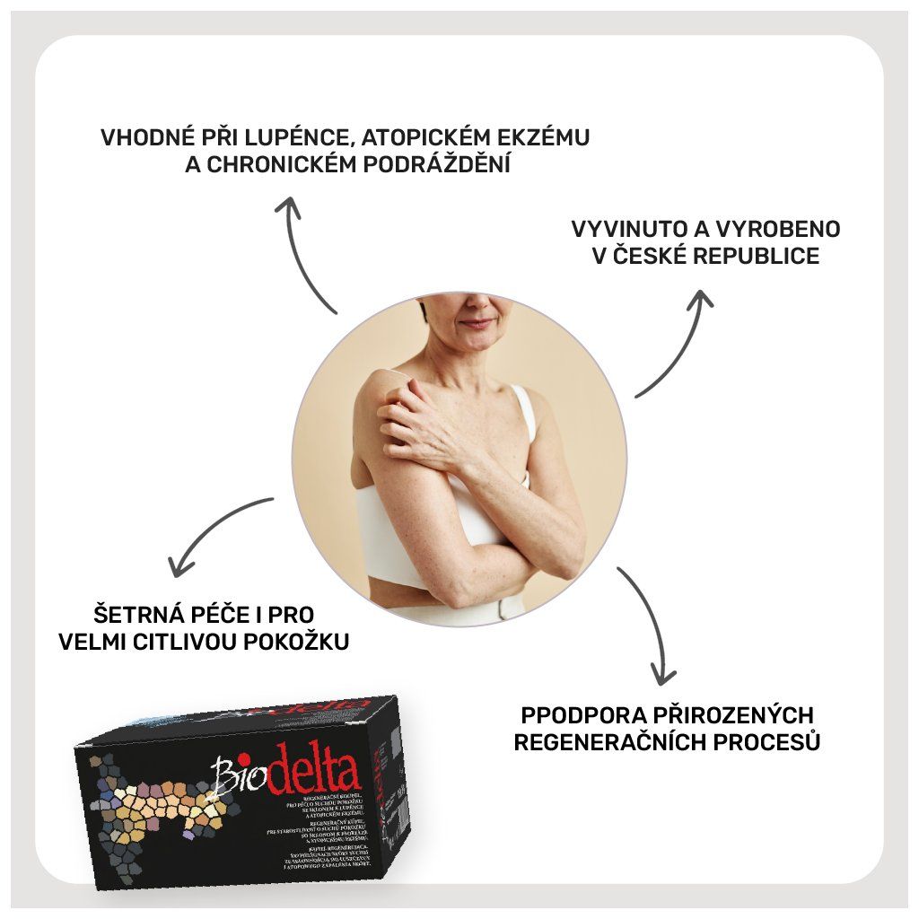 Biodelta je biologický přípravek určený ke koupelím a obkladům pro pokožku s extrémní suchostí, lupénkou, atopickým ekzémem nebo jinými formami podráždění. Produkt lze využít i k ošetření oblasti těla se špatně se hojícími místy, kde je potřeba obnovit mikrobiální rovnováhu a podpořit regeneraci.