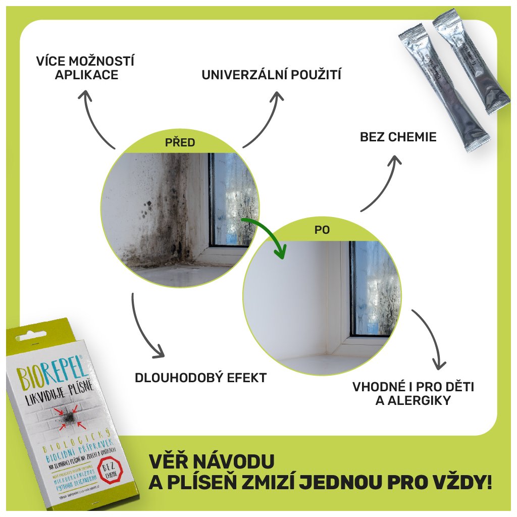 Biorepel ale pracuje jinak. Obsahuje naši patentovanou aktivní látku, která proniká hluboko do zdi a plíseň likviduje u kořene. Díky tomu má dlouhodobý účinek, funguje bezpečně bez chemie a hlavně je vyroben v Česku.