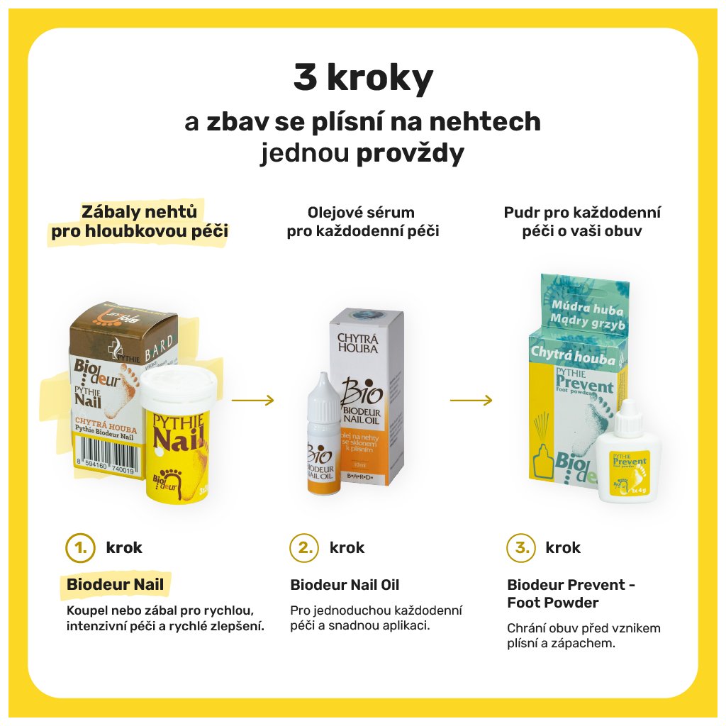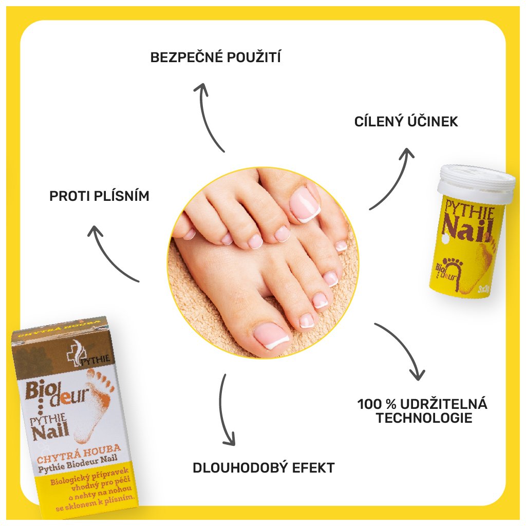 Dopřejte svým nehtům účinnou péči.Chytrá houba Pythie Biodeur Nail je biologický přípravek určený k péči o nehty se sklonem k plísním. Díky šumivým tabletám snadno připravíte zábal, který působí přes noc a podporuje přirozenou regeneraci nehtů i okolní pokožky.