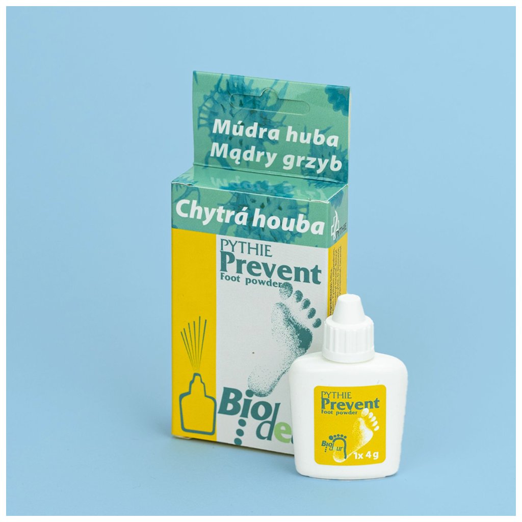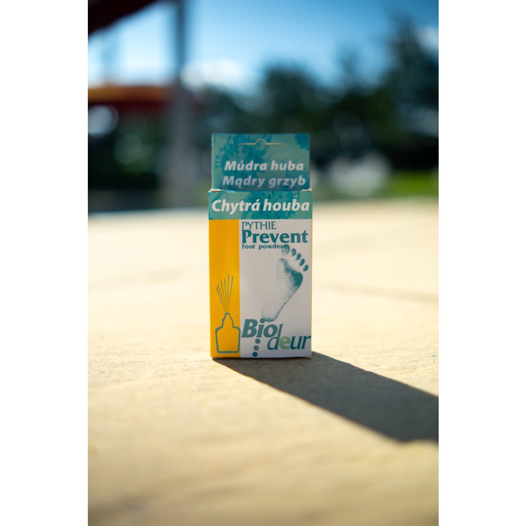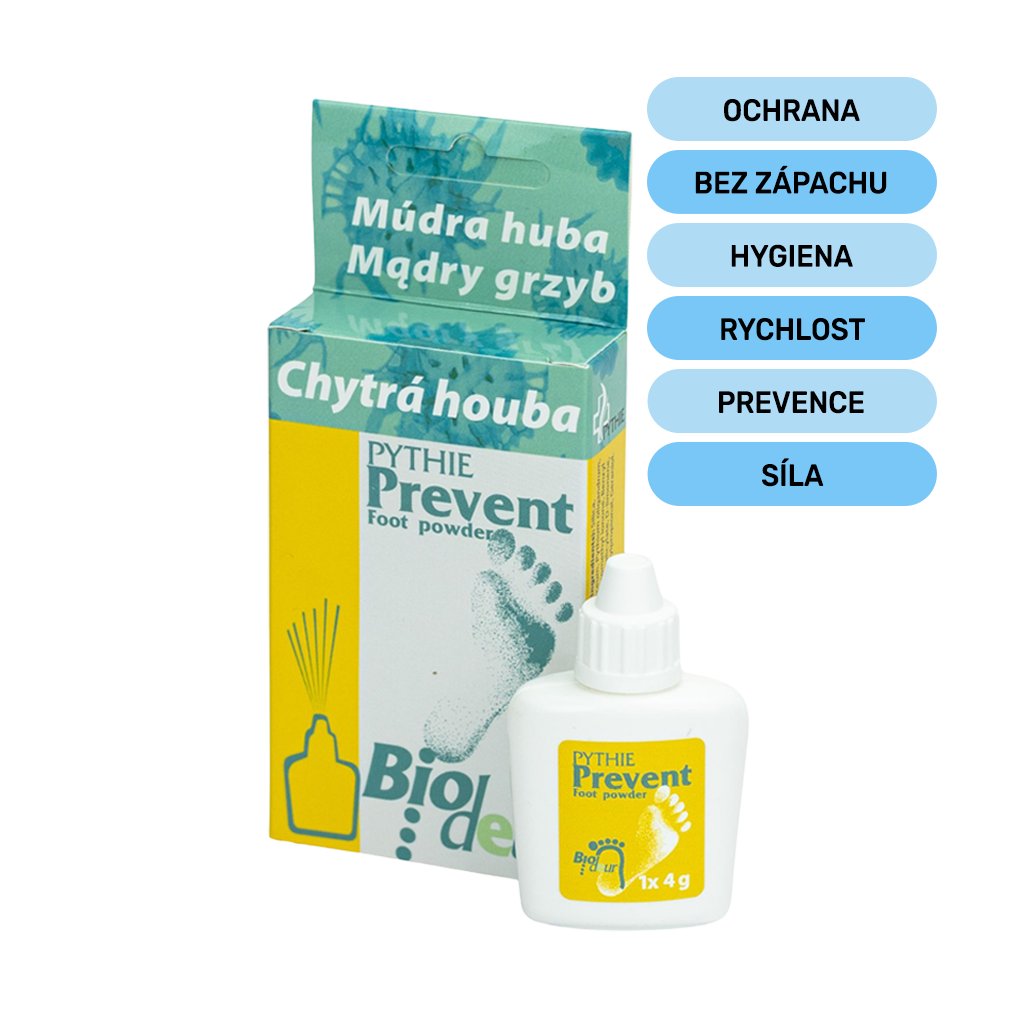 Původci mykotických problémů se nejčastěji ukrývají v botách a ponožkách. I když se vám podaří zvládnout plísně na chodidlech, obuv může být zdrojem opětovné infekce. Jemný zásyp Chytrá houba Pythie Biodeur Prevent Foot Powder pomáhá bojovat proti těmto potížím přímo v botách i ponožkách – tam, kde problém často začíná.