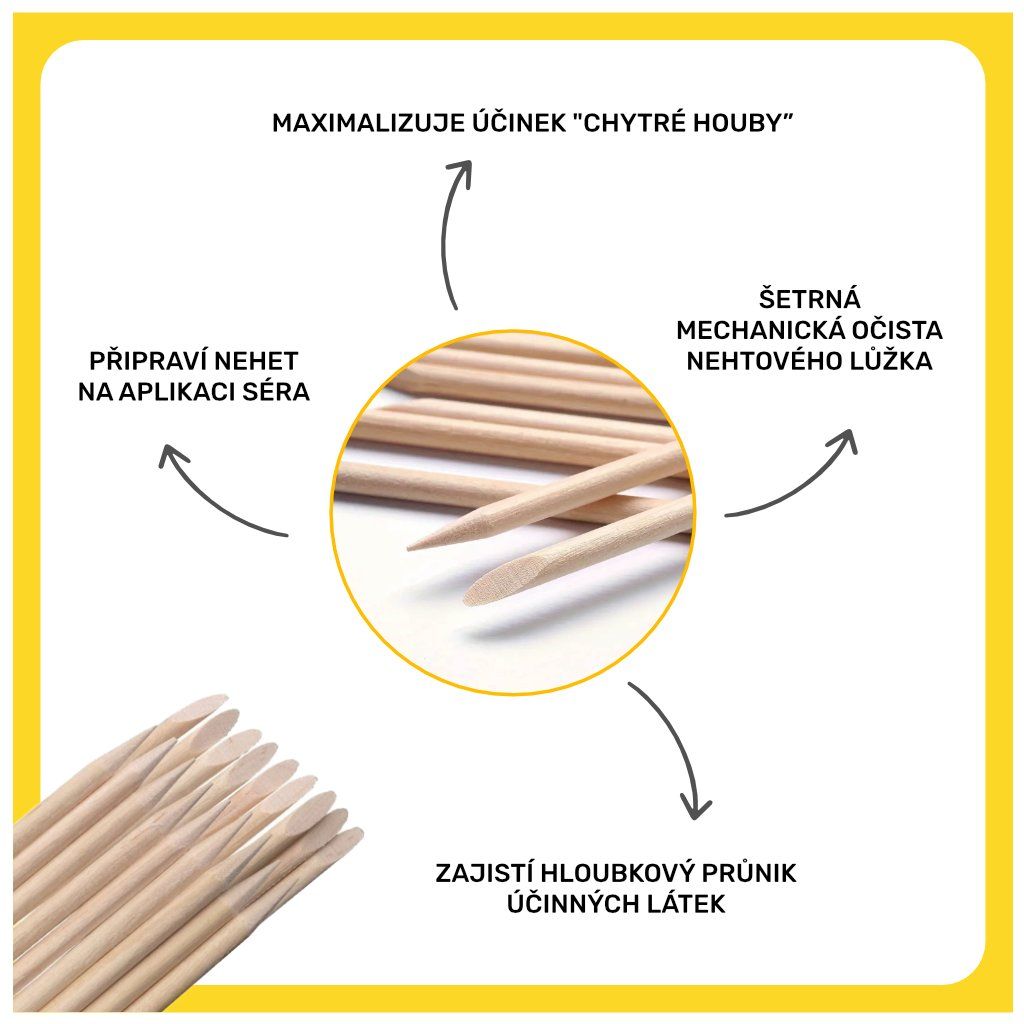 Plíseň pod nehtem není jen estetický problém, je to pevná vrstva odumřelé tkáně a nečistot, která funguje jako neprostupný štít. Pokud tento štít mechanicky neodstraníte, regenerační olej zůstane jen na povrchu a ke skutečnému zdroji nákazy se nikdy nedostane. Pomerančová dřívka jsou nezbytným nástrojem pro hloubkovou očistu: šetrně uvolní cestu do lůžka, kam se běžným mytím nedostanete. Jedině na čistém a připraveném nehtu může náš „inteligentní predátor“ zahájit svou práci naplno. Bez této přípravy dáváte plísni šanci se dál schovávat a přežívat.