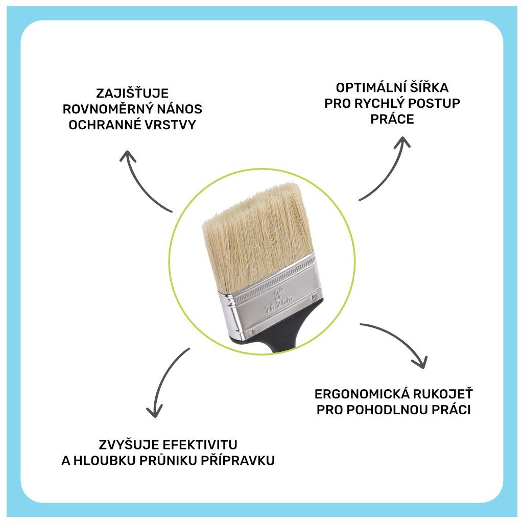 - Vysoká nasákavost: štětec výborně drží roztok, neodkapává a umožňuje plynulou práci na velkých plochách.