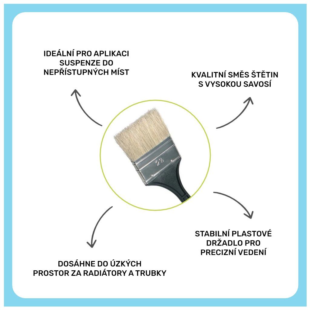 - Štětec použijte pro aplikaci roztoku v místech s omezeným přístupem (za radiátory, trubkami, v hlubokých rozích).