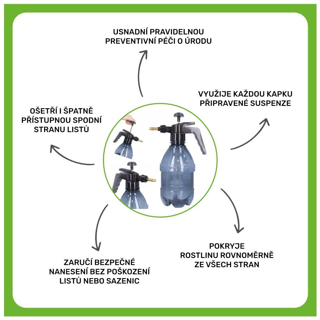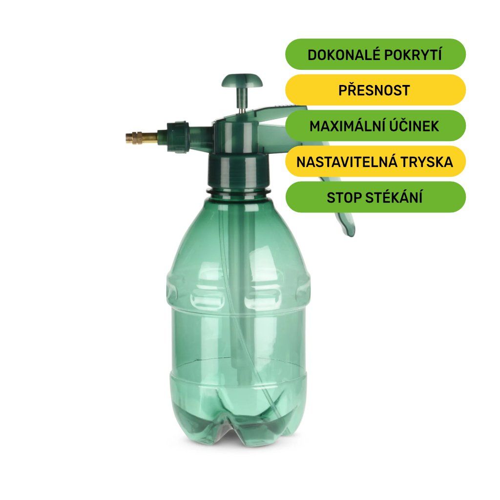 I ten nejlepší biologický přípravek potřebuje tu správnou distribuci. Náš ruční tlakový postřikovač mění aktivovaný roztok Biogardenu v jemnou mlhu. Ta dokonale přilne ke všem částem rostliny a umožní mikroorganismu Pythium oligandrum (chytré houbě) vytvořit souvislý štít, který vaši úrodu ochrání ze všech stran.